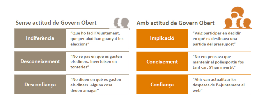 Principalment el que cal és establir una relació diferent entre la ciutadania i els seus governants, establir un diàleg permanent i bidireccional entre l’Administració i les persones a l’hora de decidir, definir i aplicar les polítiques publiques. I tot això passa per introduir i desenvolupar instruments de participació i col·laboració ciutadana en els assumptes públics. Es el que s’anomena GOVERN OBERT.